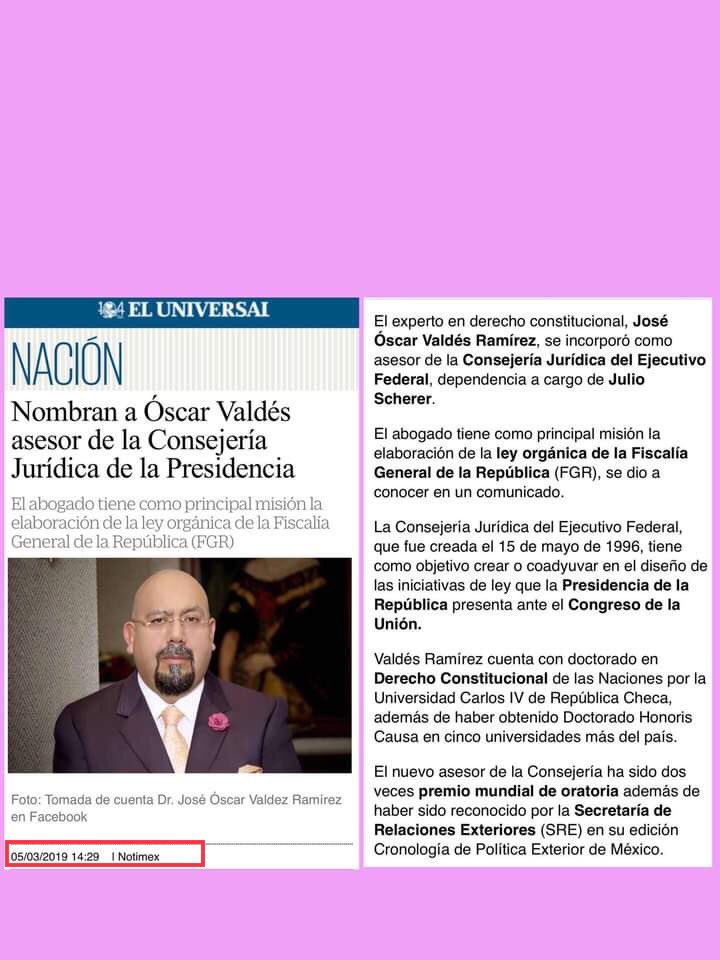 Se denuncia también que ÓSCAR VALDEZ se ostentaba falsamente como asesor de la Consejería Jurídica de la Presidencia encabezada por Julio Scherer Ibarra, pero este nombramiento se publica en el periódico El Universal y como fuente la propia agencia NOTICIOSA del gobierno NOTIMEX.
