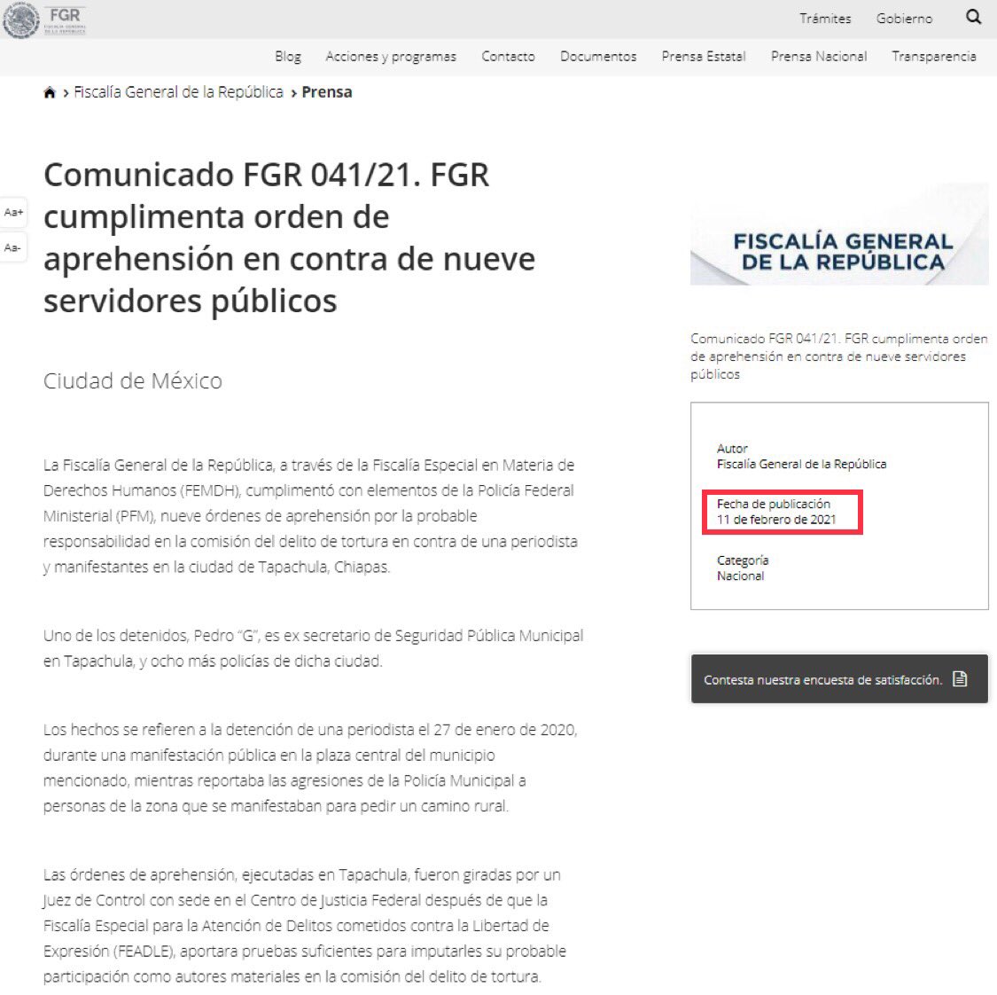 Para mostrar cómo actúa la FGR en una detención, está el caso d un exJefe policiaco d Tapachula, Chiapas, quien fue detenido junto con 8 policías por torturar a una periodista; la detención se publica en la prensa el 11/febrero/2021 y ese mismo día aparece un COMUNICADO en la FGR