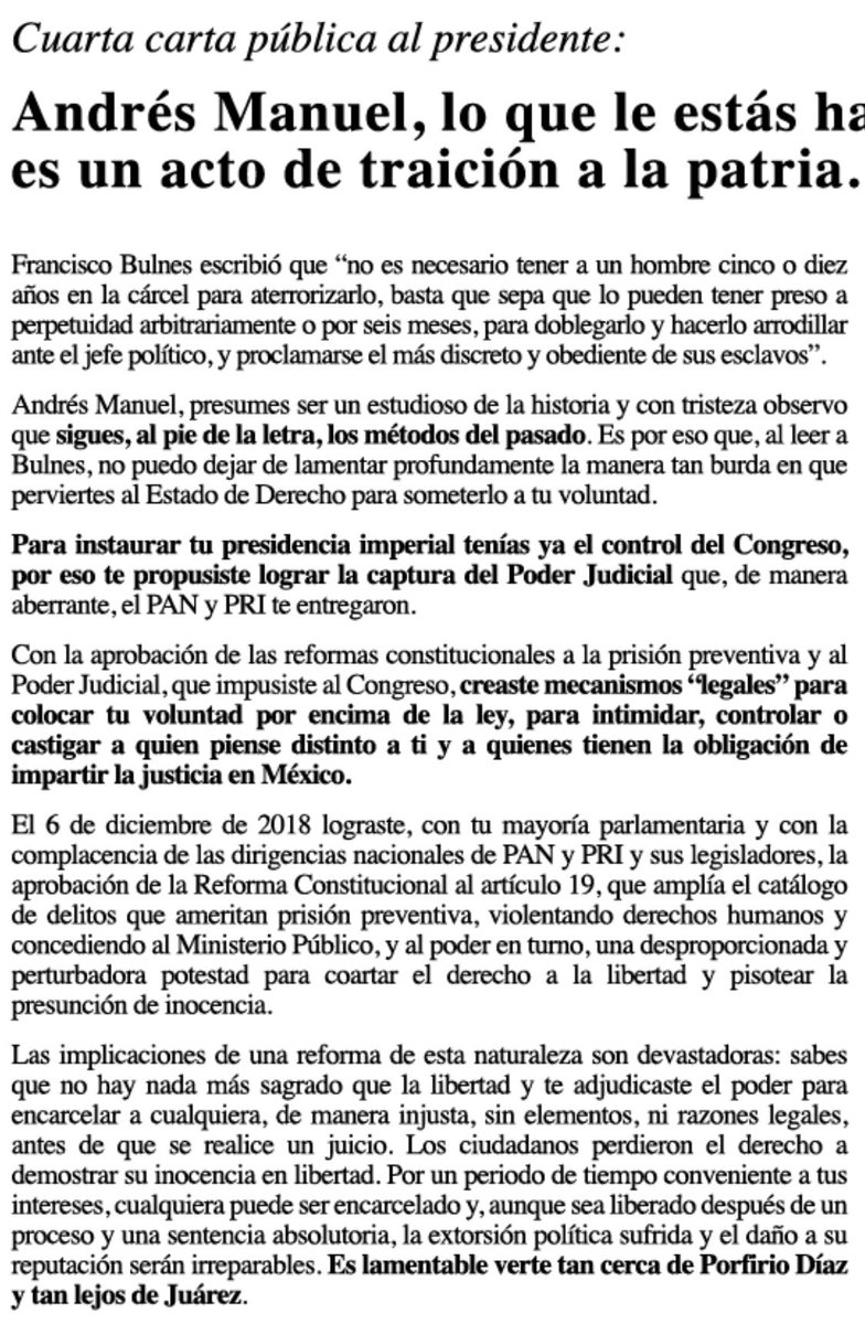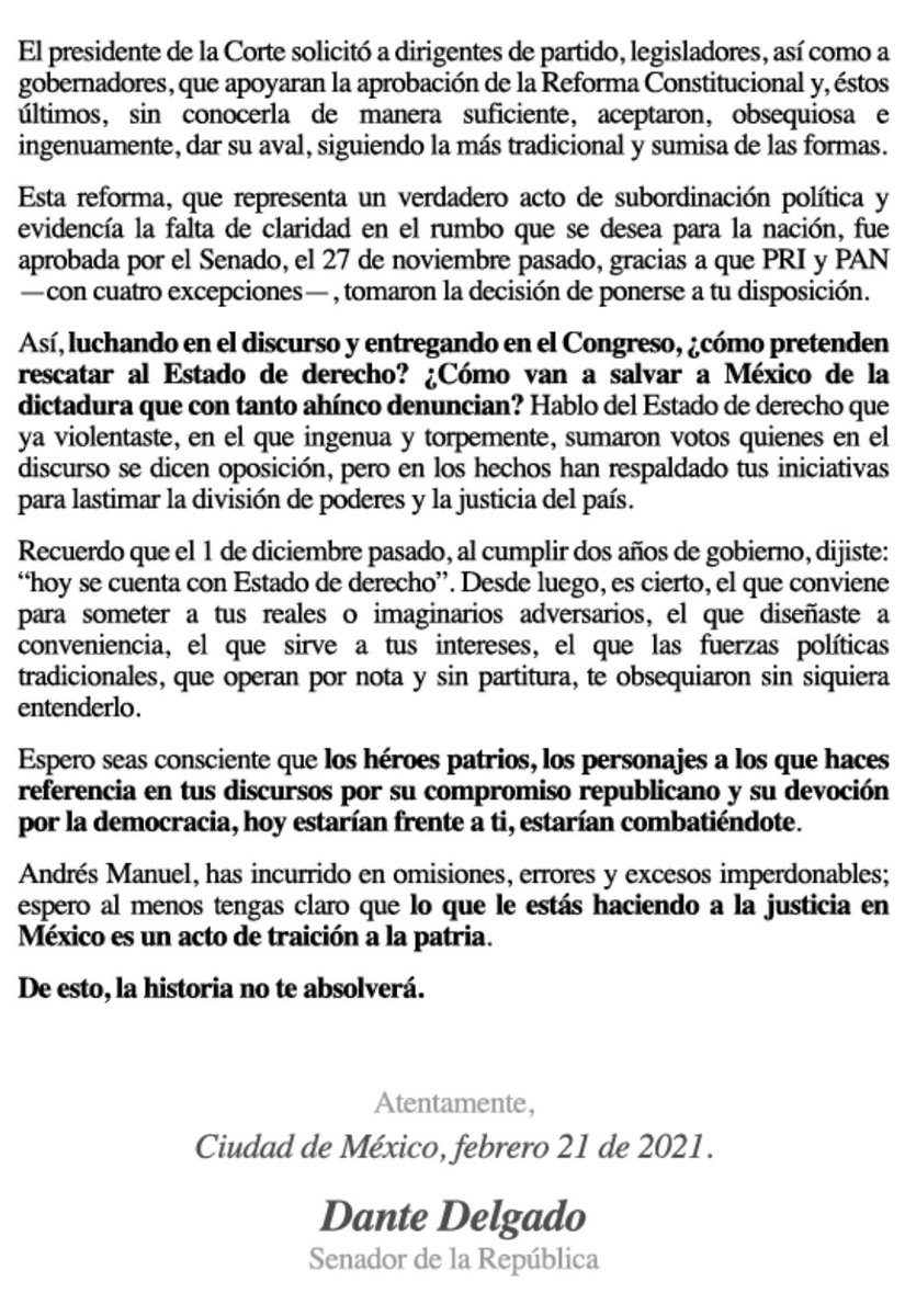 Para concluir compartimos la 4ta. Carta a AMLO del Senador Dante Delgado publicada este pasado domingo, donde se explican con claridad, las mañas jurídicas légaloides que está usando AMLO, para callar o presionar a opositores.