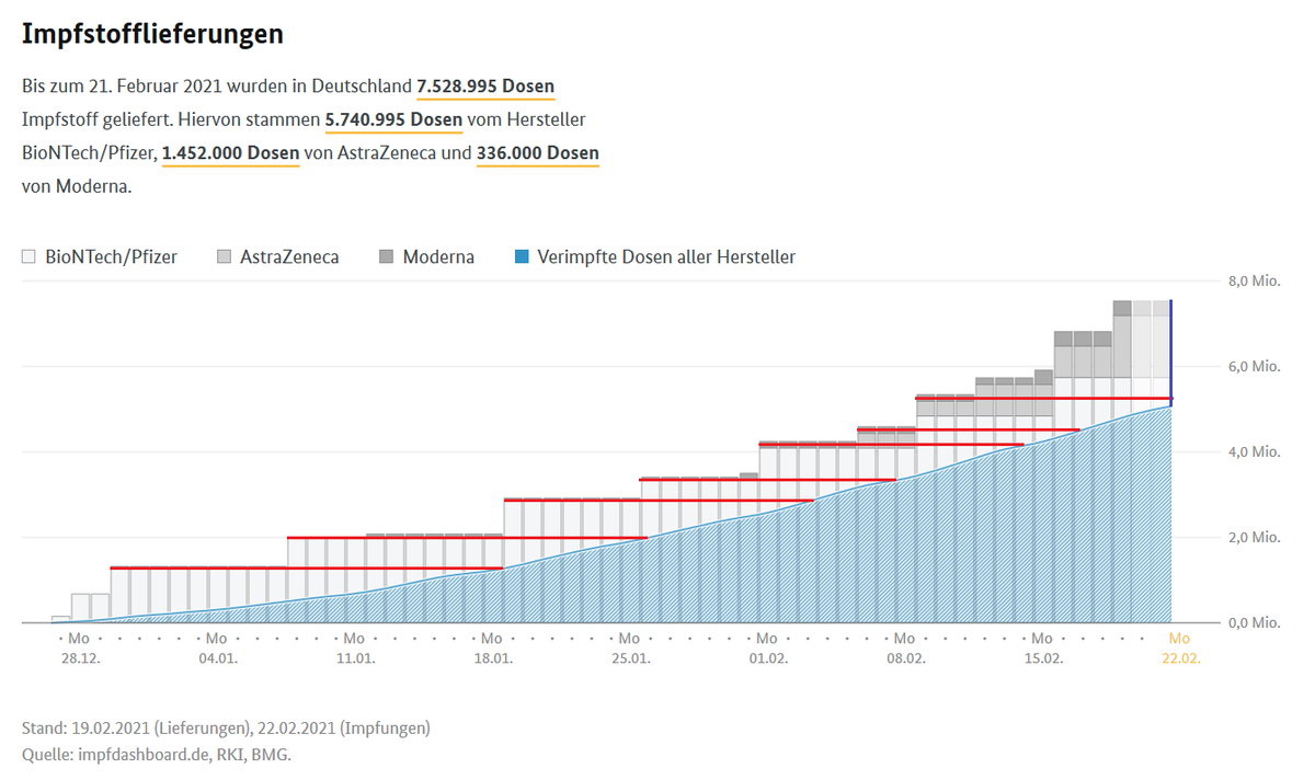 .@Street_Dogg hat mich netterweise auf impfdashboard.de verwiesen. Er hat in die Grafik rote Balken eingezeichnet, die messen, wie viele Tage maximal zwischen Lieferung und Verimpfung vergehen. Das sind ungefähr 2-3 Wochen momentan. Anscheinend Vorrat für 2. Impfung. 5/