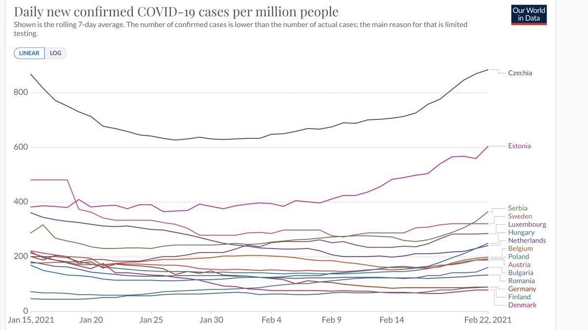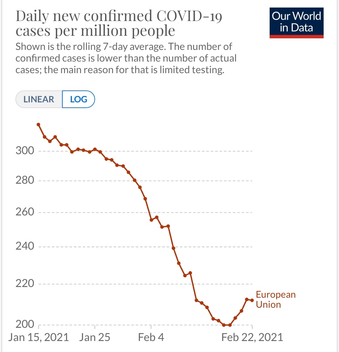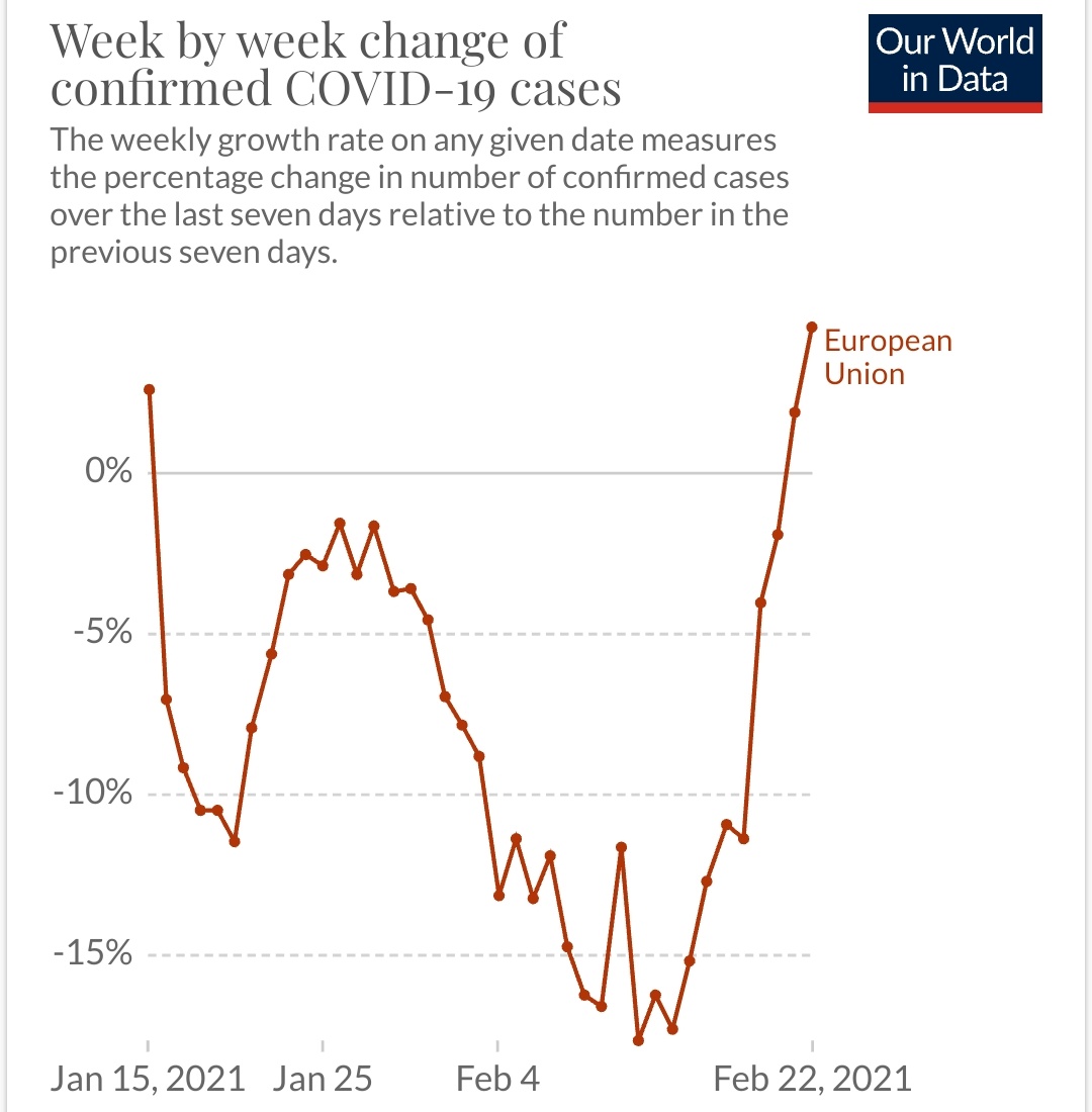 In den meisten EU-Ländern ist der Trend in letzten 2 Wochen wie in Deutschland - die Zahlen steigen wieder, und immer schneller. Genau wie man wegen Mutanten erwartet.