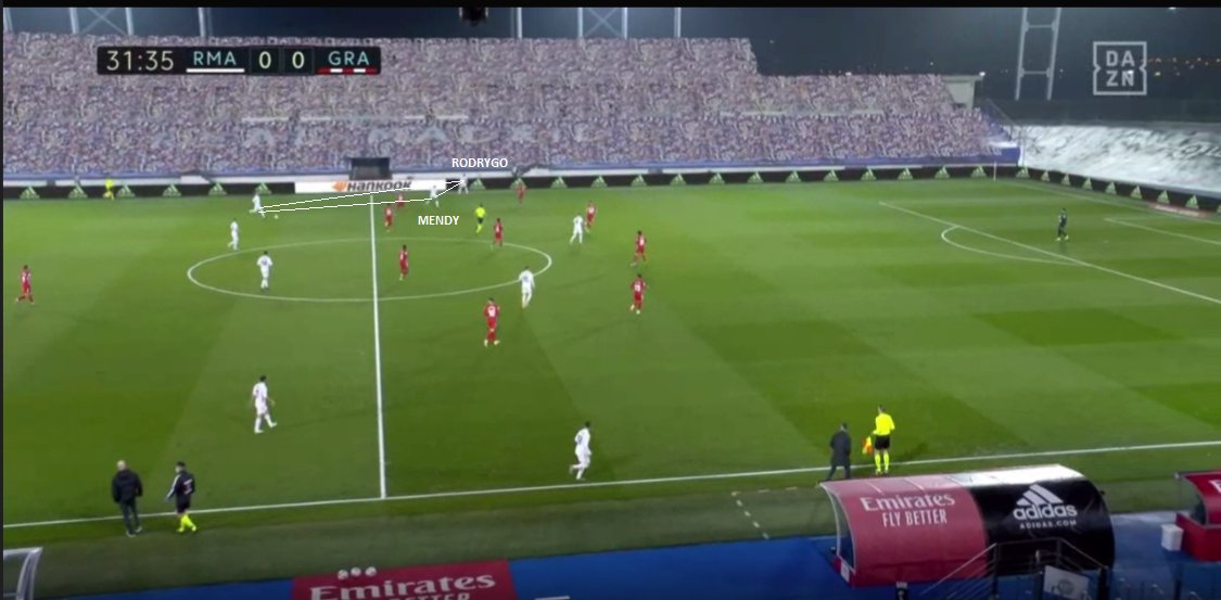 Nelle slide sotto: #Rodrygo riceve largo, mentre Mendy attacca la profondità