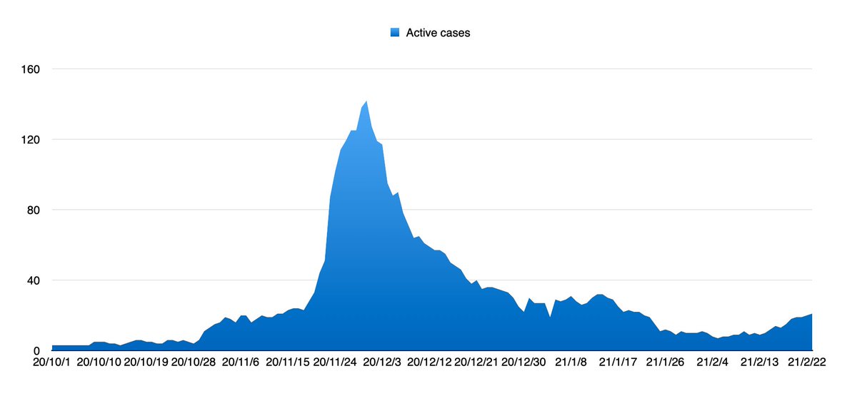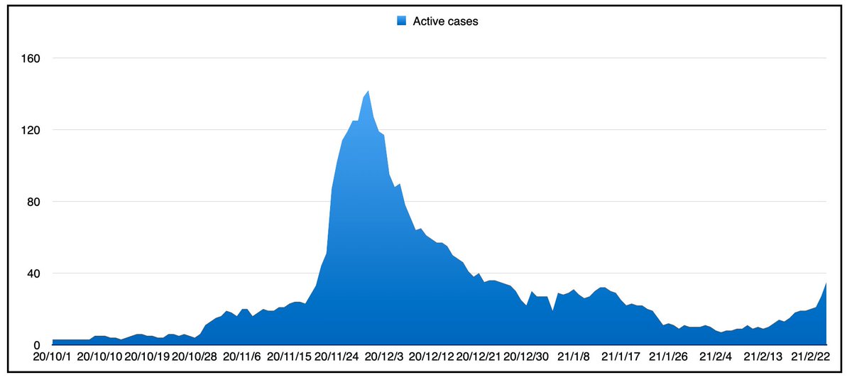 And here is the active caseload, heading the wrong direction but still much lower than in the December outbreak: