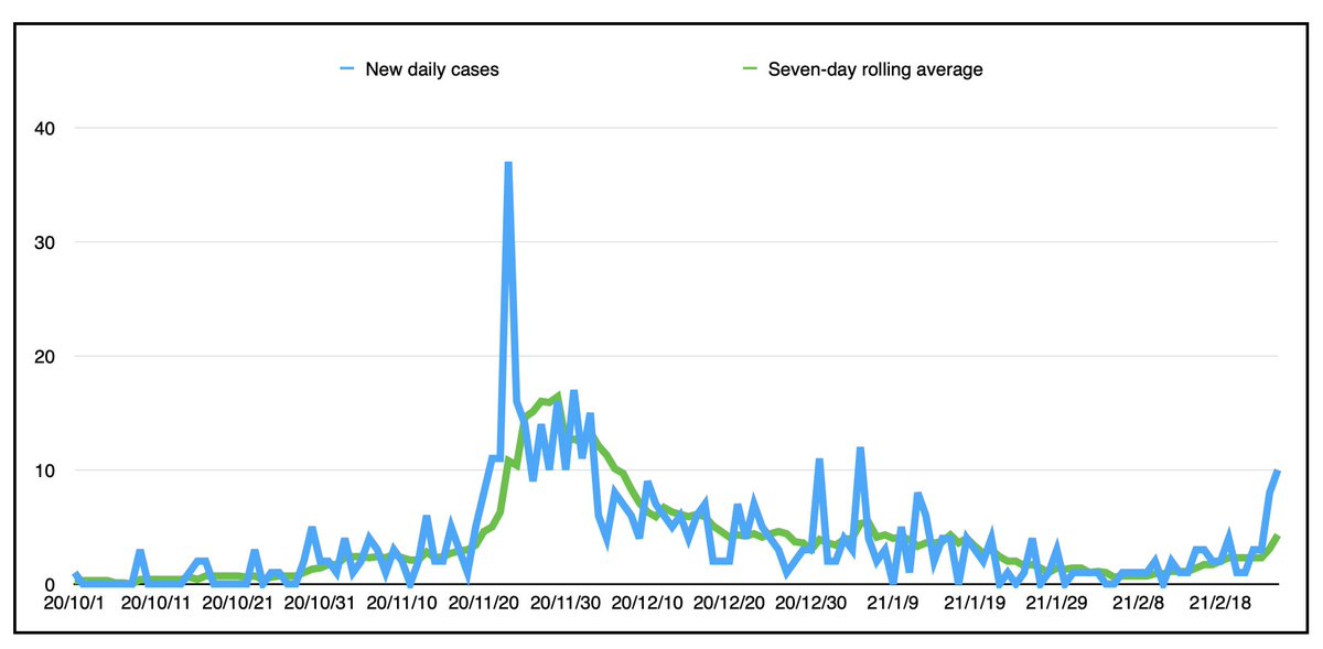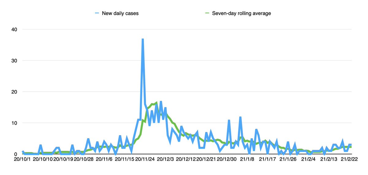 Here is the graph of daily new cases and the 7-day rolling average (which remains at 2.3):