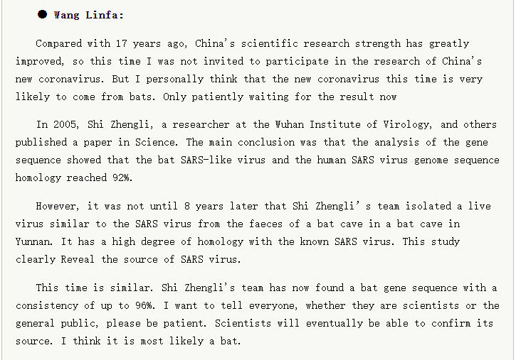 "Indeed, from 2003 to 2004, the SARS virus leaked in 3 laboratories, causing certain harm. However, in general, I think the ban on SARS virus research has been overreacted since then."