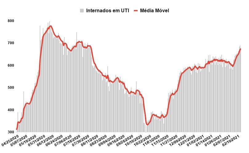 Nos leitos municipais do boletim da prefeitura a situação é a mesma, começou a cair, mas ainda em níveis muito altos, acima de todo o segundo semestre do ano passado.