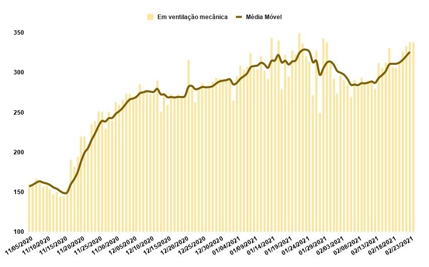 A situação dos leitos de UTI é ainda pior, está próxima do pico de junho e continua subindo na cidade. Mesma coisa para o numero de paciente em ventilação mecânica.