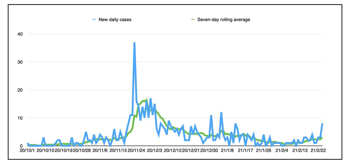 Here is the graph of the daily new cases and the 7-day rolling average (today at 3.1):