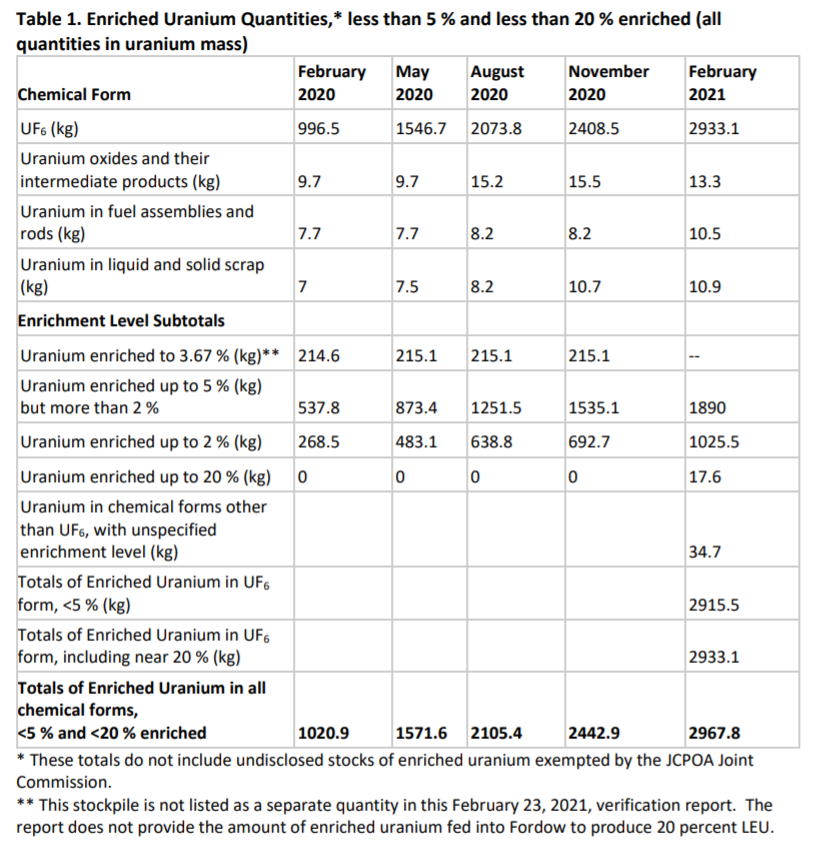 تا ۱۶ فوریه ۲۰۲۱ مجموع تولید اورانیوم غنی شده ایران تا سقف ۵ درصد تقریبا ۲۹۶۸ کیلوگرم اورانیوم بوده.