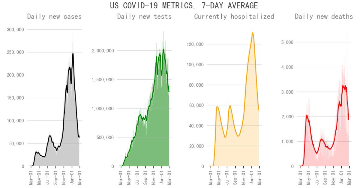 Although progress in US has been significant, daily cases, deaths, and hospitalizations are still very high compared to earlier in the pandemic