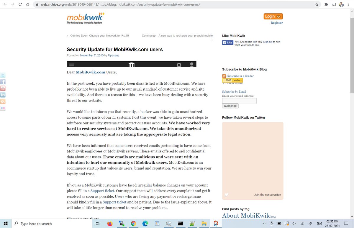 As a customer of @MobiKwik It is my right to ask you, why you deleted you blog post of previous unauthorized server access(in 2010) after my tweet. I think it's a big controversy now.. what was the need of this step. Hiding things is not a solution. @IndianCERT@RBI#InfoSce