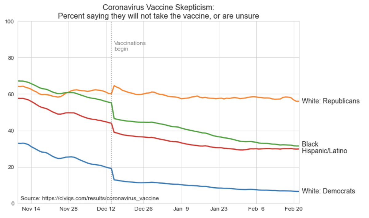 A major political elite group who are either risking lives or failing to communicate well to save them are US Republicans. Vaccine hesitancy is shrinking in the United States, but hesitancy is very high and stubborn among GOP voters