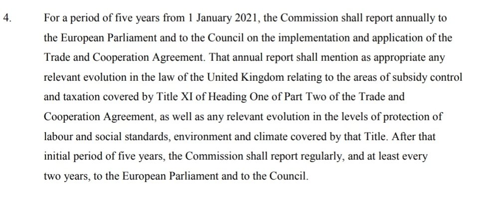 4/ Commission reports on the treaty must include details on UK subsidy, tax, labour and environmental standards. (The Council added this bit).