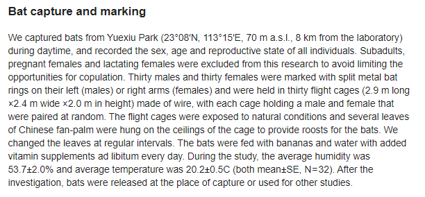 "Thirty males and thirty females were held in thirty flight cages (2.9 m long ×2.4 m wide ×2 m in height) made of wire" "Bats were... used for other studies"