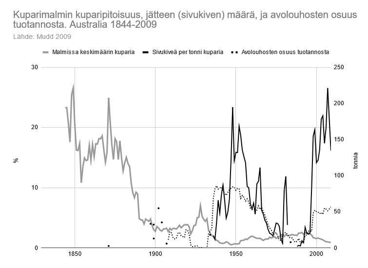 Tuosta näkee miten järkyttävästi jätteen määrä lisääntyy kun avolouhosten osuus tuotannosta nousee edes 10 prosenttiin. Ja kaivostoiminta on menossa kohti avolouhoksia, kun köyhiä malmioita ei kannata kaivaa maan alla.