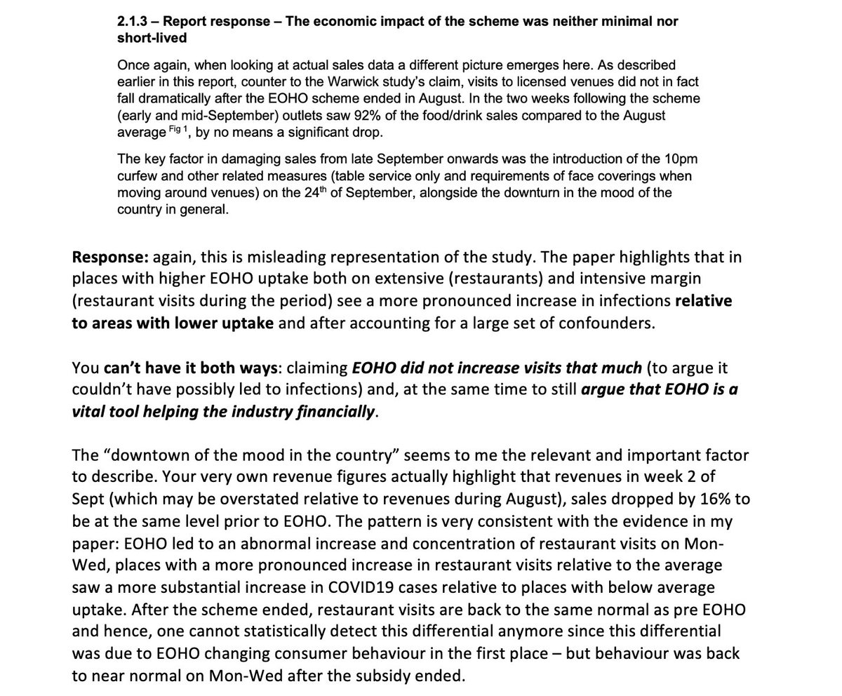 So @UKHofficial did have a look at my paper on #EOHO and #COVID19 - they have gone to some lengths to try to cast doubt about my research, the methods & results (see ukhospitality.org.uk/page/SafeReope…). So here are their point-by-point lines of attack on my work and my response. Thread 🧵⬇️