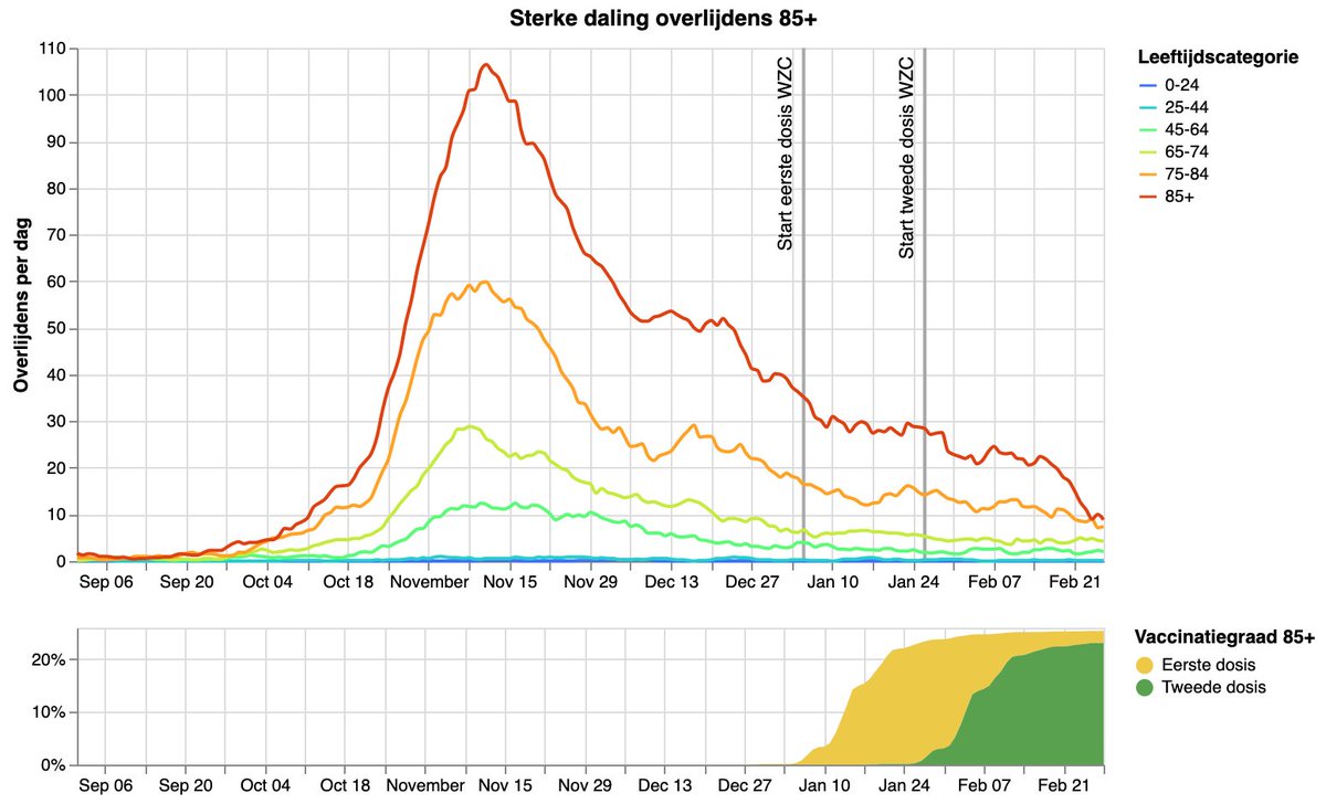 Hier zien we een duidelijke en indrukwekkende daling van 10-20 overlijdens per dag bij de 85+'ers die te linken valt aan de vaccinatiecampagne. Het inzetten van onze eerste schaarse vaccins in deze kwetsbare groep lijkt dus een goede en impactvolle keuze te zijn geweest. 9/9
