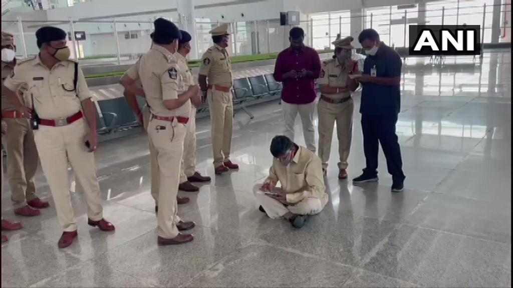 Andhra Pradesh: TDP leader and former Chief Minister N Chandrababu Naidu sat down in protest at Tirupati airport in Renigunta after he was detained by Renigunta police while he was going to attend election campaigning in Chittoor district.