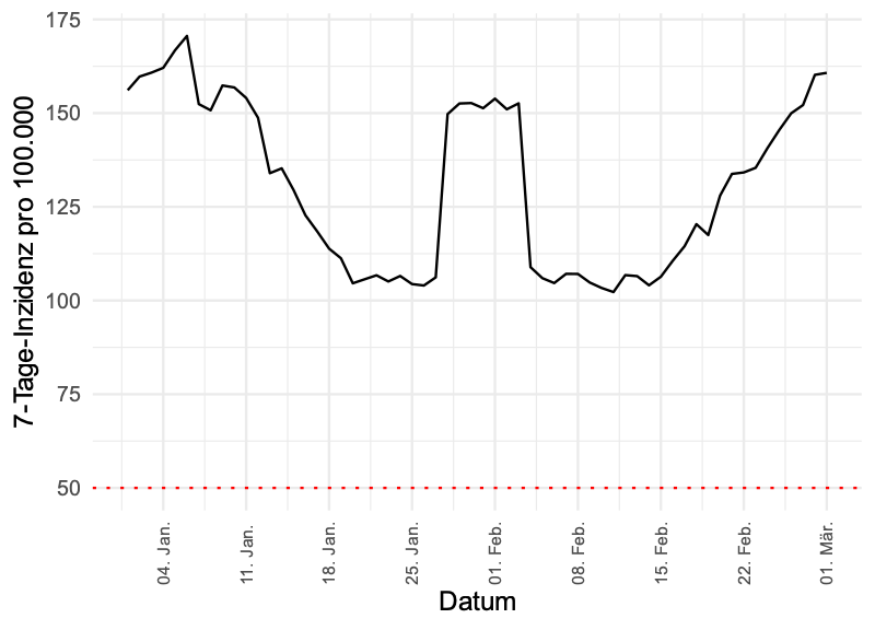 Die 7-Tage-Inzidenz pro 100.000 Einwohner beträgt damit 160, (gestern 152 und vor einer Woche 134).