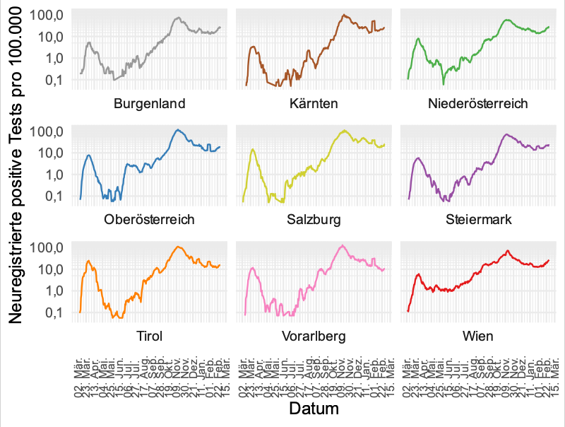 7-Tage-Mittel positive Tests - Österreich - logarithmische Skala