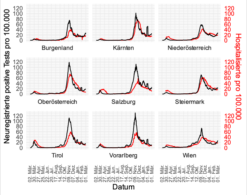 Neue positive Tests und Hospitalisierte (7-Tage-Mittel) - Bundesländer