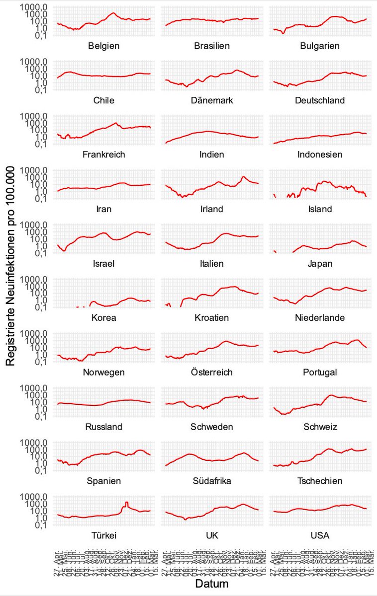 Ausgewählte Länder - Inzidenzen (7-Tage-Mittel) - logarithmische Skala