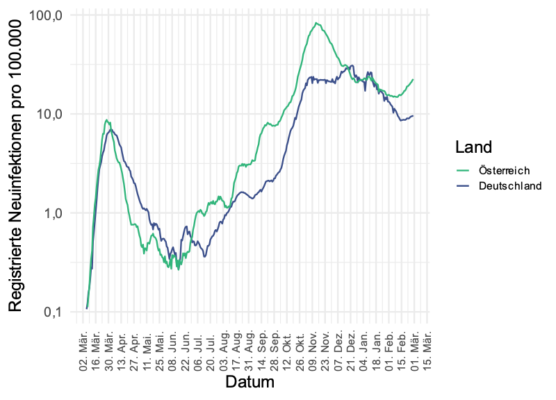 Österreich - Deutschland - Inzidenzen (7-Tage-Mittel) - logarithmische Skala