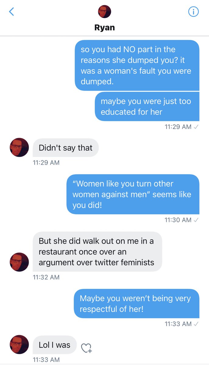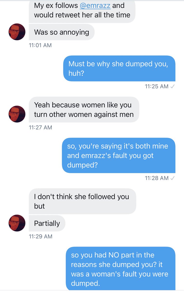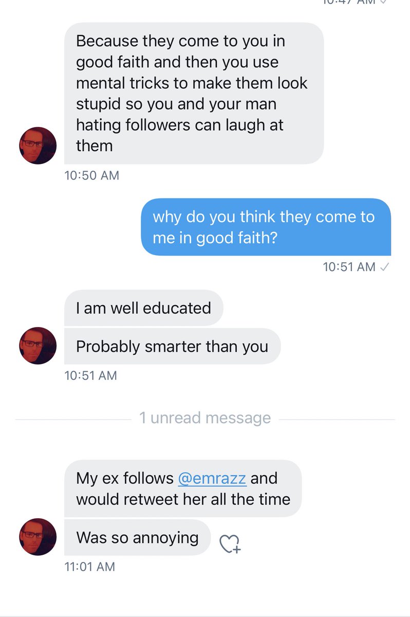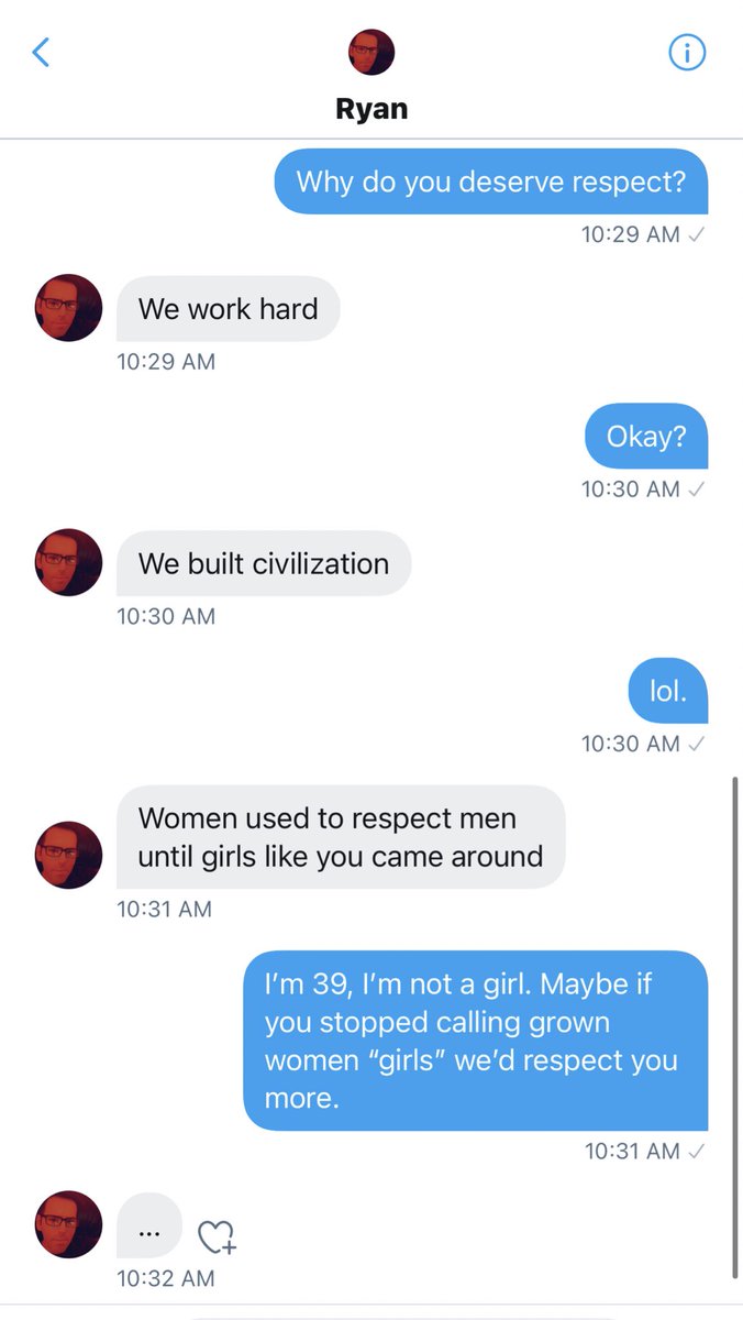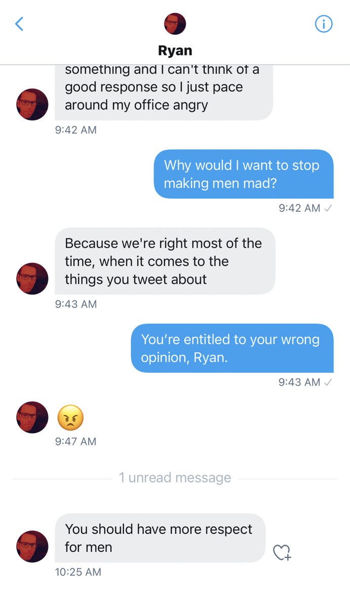 So, here’s the thing, this dude cannot handle when I do not reply to him so he comes back at me telling me how much I disrespect men. This is TEXTBOOK misogyny.