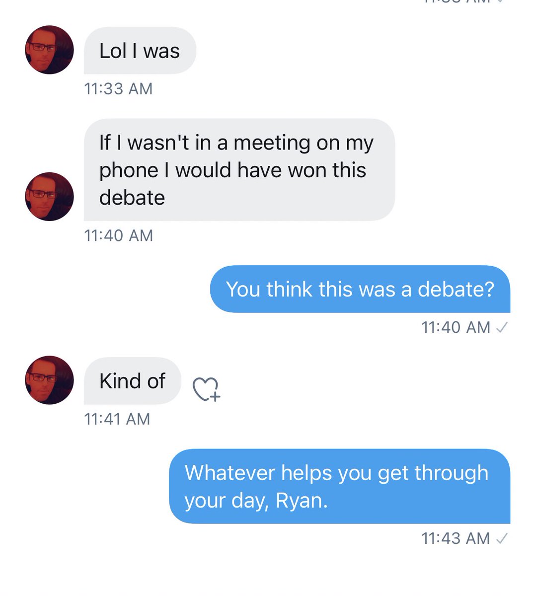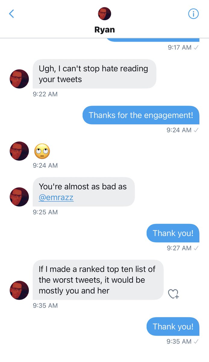 *PS. If you want to know why I have my DMs open it’s because a lot of times people will ask me to amplify a request for help or ask me questions. Even say something nice! there are shitty dudes whom I rarely engage but every once in a while I do and it’s just perfect content.