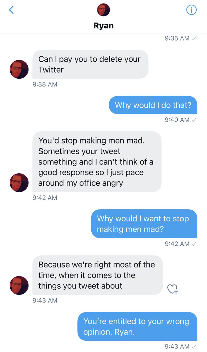 A note to every single man in this website - just because you slide into my DMs, I am under no obligation to keep the conversation private. That’s not how this works.