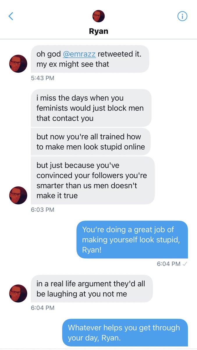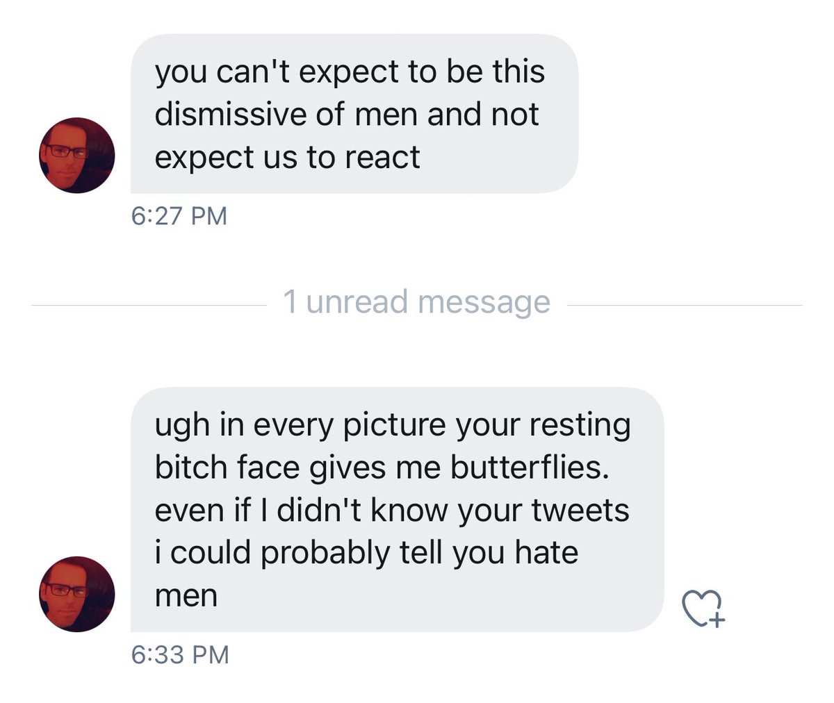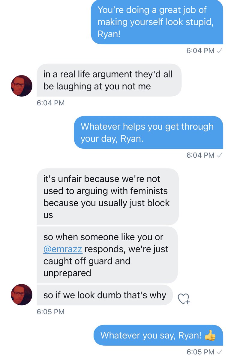 there are literally dudes in my mentions defending this guy because he's being "nice" (and by "nice" they mean not telling me to kill myself)