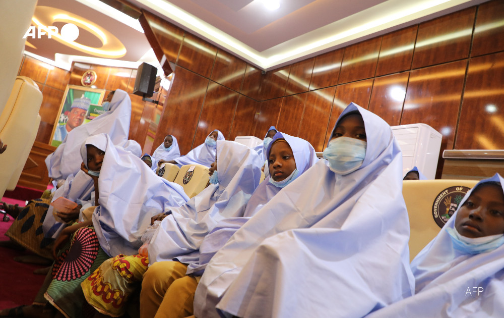 Some of the 279 students kidnapped from their boarding school in northern Nigeria are seen at Government House in Gusau, Zamfara State, after their release.