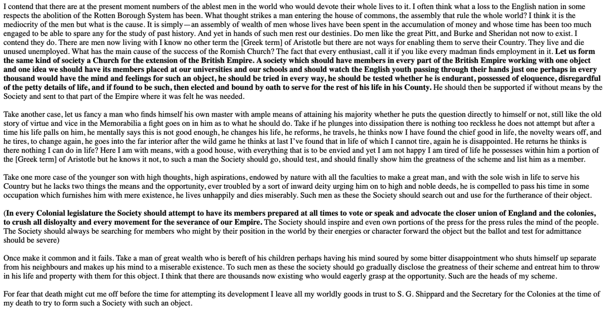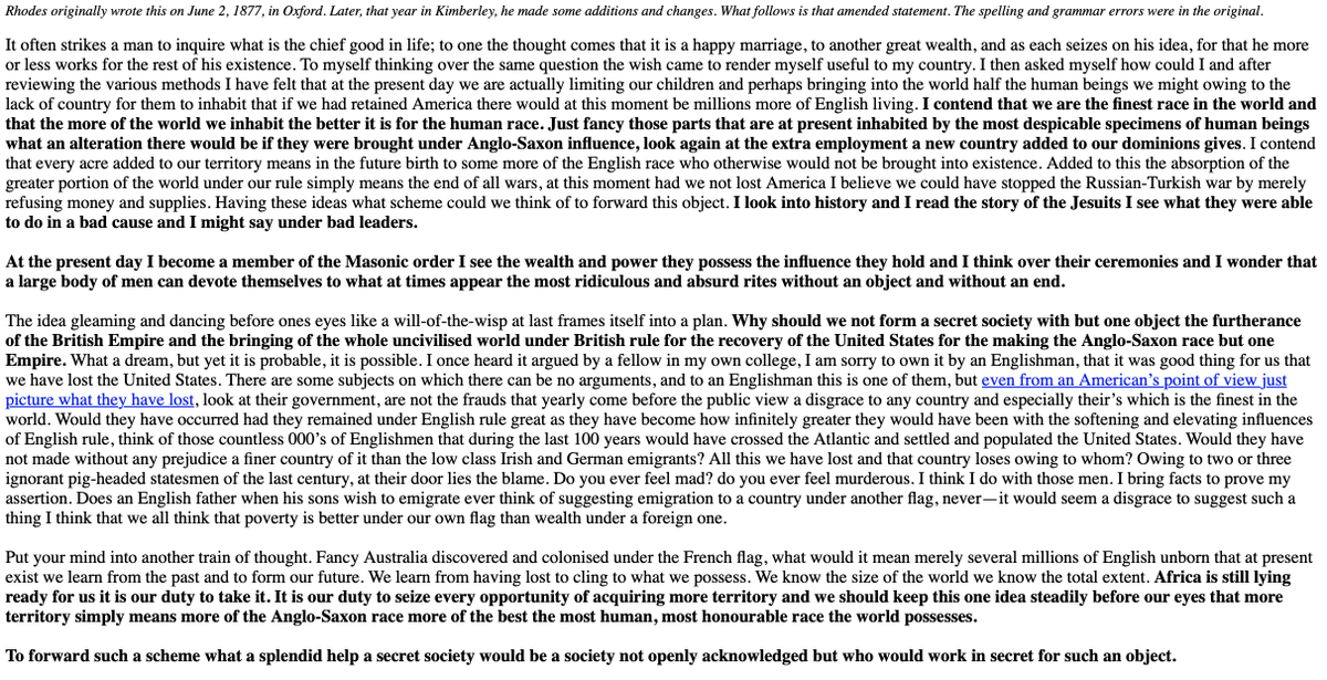 For those who don't like to click links, here are screen captures of the one link given above. It's Cecil Rhodes "Confession of Faith" which he wrote in 1877. While Oxford may worship him, it's clear how an Indian student or any from a colonized culture reading his views may not.