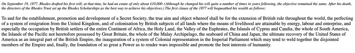 And here is the text of first clause of Cecil Rhodes first will that Samant referenced. Again, anyone coming from a nation that had to endure British colonialism & Christian imperialism will not have a positive view of Cecil Rhodes for obvious reasons.