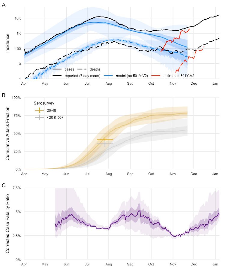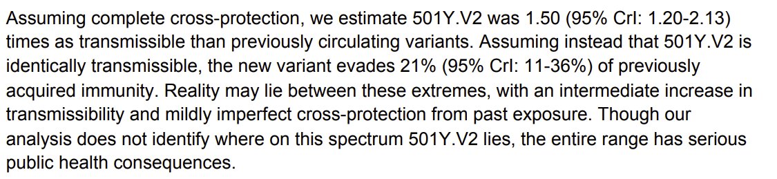For S Africa, data are consistent either w/ 50% increased transmissibility or 21% increased immune evasion (ability to infect those w/ immunity from previous infection) or combination of these 2. @cap1024 cmmid.github.io/topics/covid19…