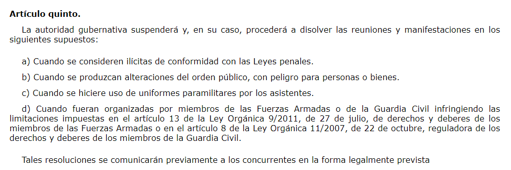 No confundir "prohibir" con "disolver" una manifestación, esto último puede realizarse por estos motivos de la misma LO 9/83, tipificados en el artículo 5 :