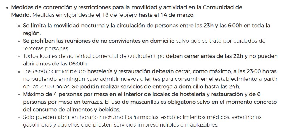 Información de la Comunidad de Madrid sobre las restricciones actuales, página oficial de la Comunidad Autónoma. comunidad.madrid/servicios/salu…