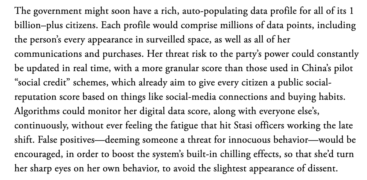5/ In the decades to come, these systems may even be able to read unspoken thoughts. Server farms across China will soon be able to hold multiple angles of high-definition footage of every moment of every Chinese person’s life. theatlantic.com/magazine/archi…