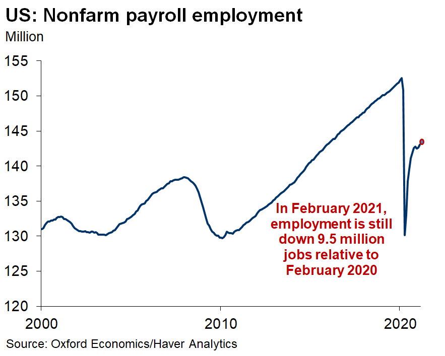 Because despite the hype about today's strong #jobsreport and despite the 12.9 million jobs recovery since April 2020, 🇺🇸employment remains 9.5mn lower than pre-pandemic.