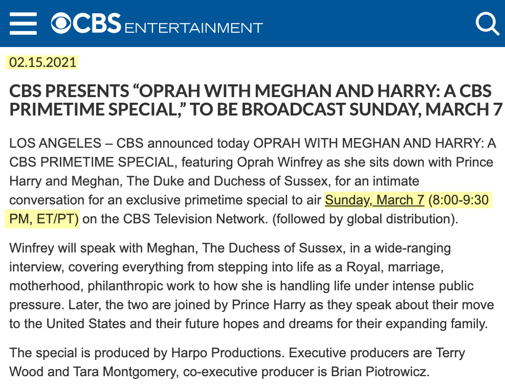 2/15: @CBS announces 90min Harry + Meghan + @Oprah special