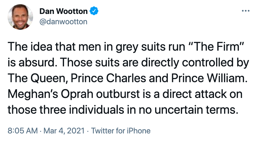 The video's 4th "royal expert" — who gave an opinion on Meghan supposedly telling Oprah about donkey sanctuaries and being an anti-vaxxer — is Dickie Arbiter, @RoyalDickie, a palace press secretary from 1988-2000