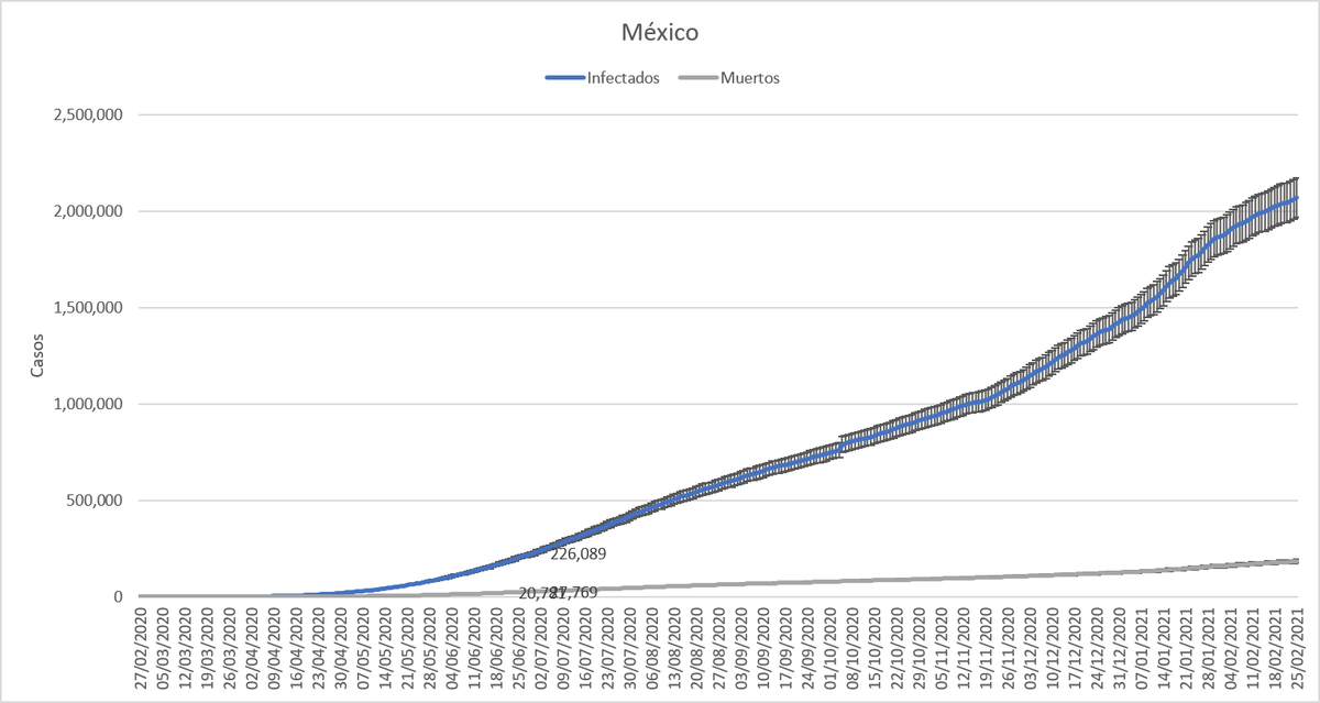 La proyección para el día de hoy era de 2,118,744 casos nuevos y 189,416 decesos. La @SSalud_mx reporta 2,119,305 casos y 189,578 defunciones. La proyección para mañana es de 2,125,436 casos nuevos y 190,227 decesos.