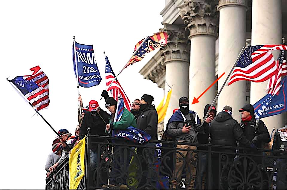 A 'Liftwaffen' mask used by U.S. Nazi terrorists, seen at Capitol veranda. The Nazi Oberkommando der Luftwaffe committed war crimes, human experimentation, sent 1000's of Jews to die in camps, & massacred 100's of 1000's in Europe. #SeditionHunters#CapitolHunters#CapitolPatches