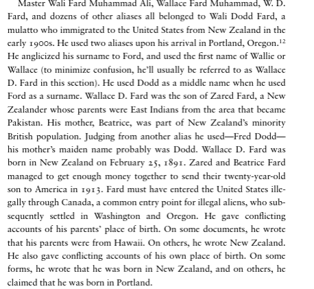 More digging into Fard’s repeated divorces under slightly different names (“George Farr”, “Wali Fard”, “Fred Dodd” ) discovered that he had immigrated from New Zealand, the son of a Pashto father and white mother. His real name seems to be Wali Dodd Fard.
