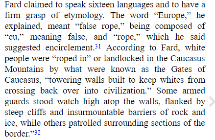 At different times in his life Fard posed as a self-taught genius who spoke 30 languages. In truth, he was functionally illiterate to the point had to dictate letters home to New Zealand to his wife. He taught his followers the TRUE etymology of Europe: it means “bad rope”.