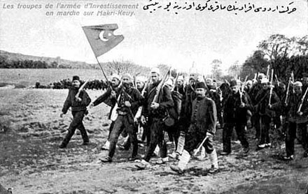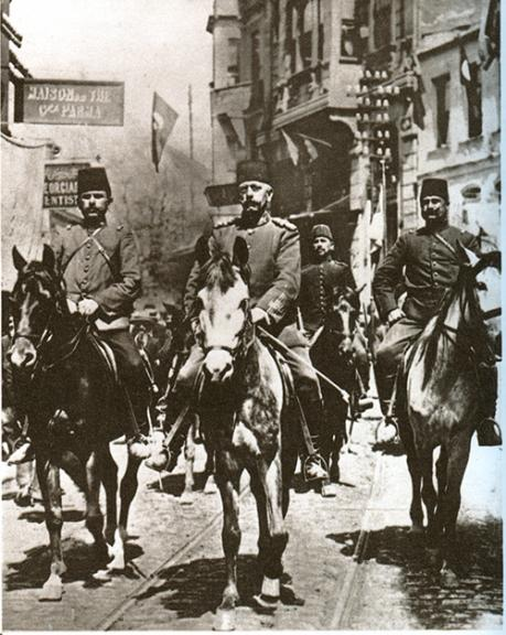"Kohne Bizans'in yildiz burcunda ikamet eden baykus!" dedigi Abdulhamit'e ve para vererek isyan ettirdigini iddia ettigi avci taburlarina haddini bildirmek icin yola cikmak uzere olan orduya hitap eden Kudretli(!) Mahmut Sevket pasa!