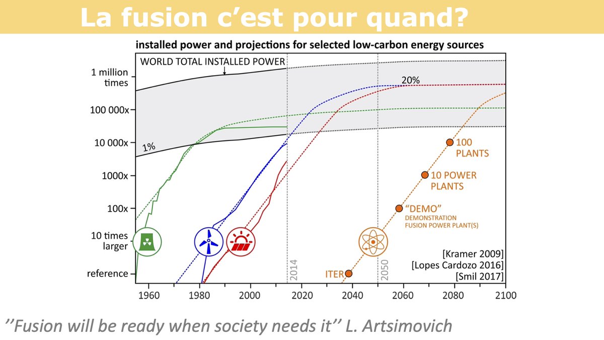 Si on prend cette échelle de temps et qu’on applique les mêmes vitesses de déploiement que pour le nucléaire, l’éolien et le PV, on aurait 10 réacteurs (1GWelec) dans les années 2070 et 100 dans les années 2080. La fusion pourrait représenter 1% de la demande énergétique en 2100
