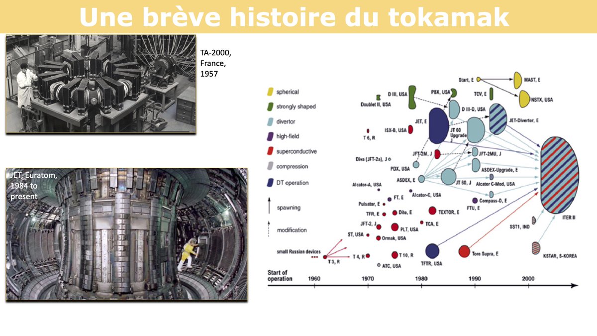 Les recherches démarrent vraiment à la fin de la 2ème guerre mondiale mais sont initialement secrètes, guerre froide oblige. Les USA, l’URSS, l’Angleterre rejoints ensuite par la France. 2 voies en parallèle : la recherche sur la bombe H, et le confinement magnétique…