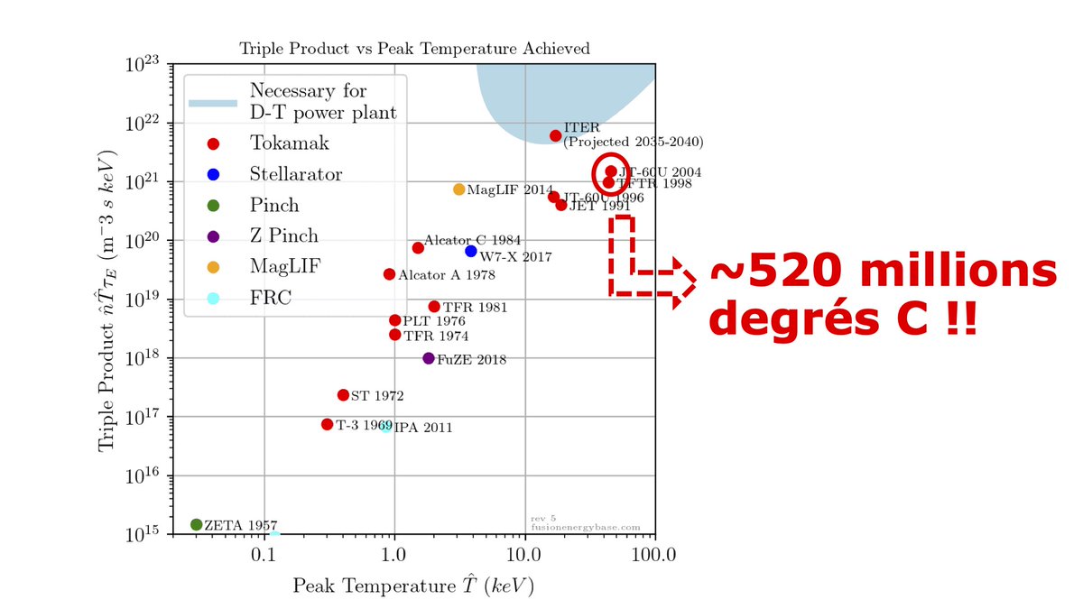 En parallèle, les performances des machines de fusion, caractérisées par le produit triple (densité*température*confinement) progressent régulièrement. TFTR en 1998 et JT60-U (Japon) atteignent des températures de plus de 500 millions °C