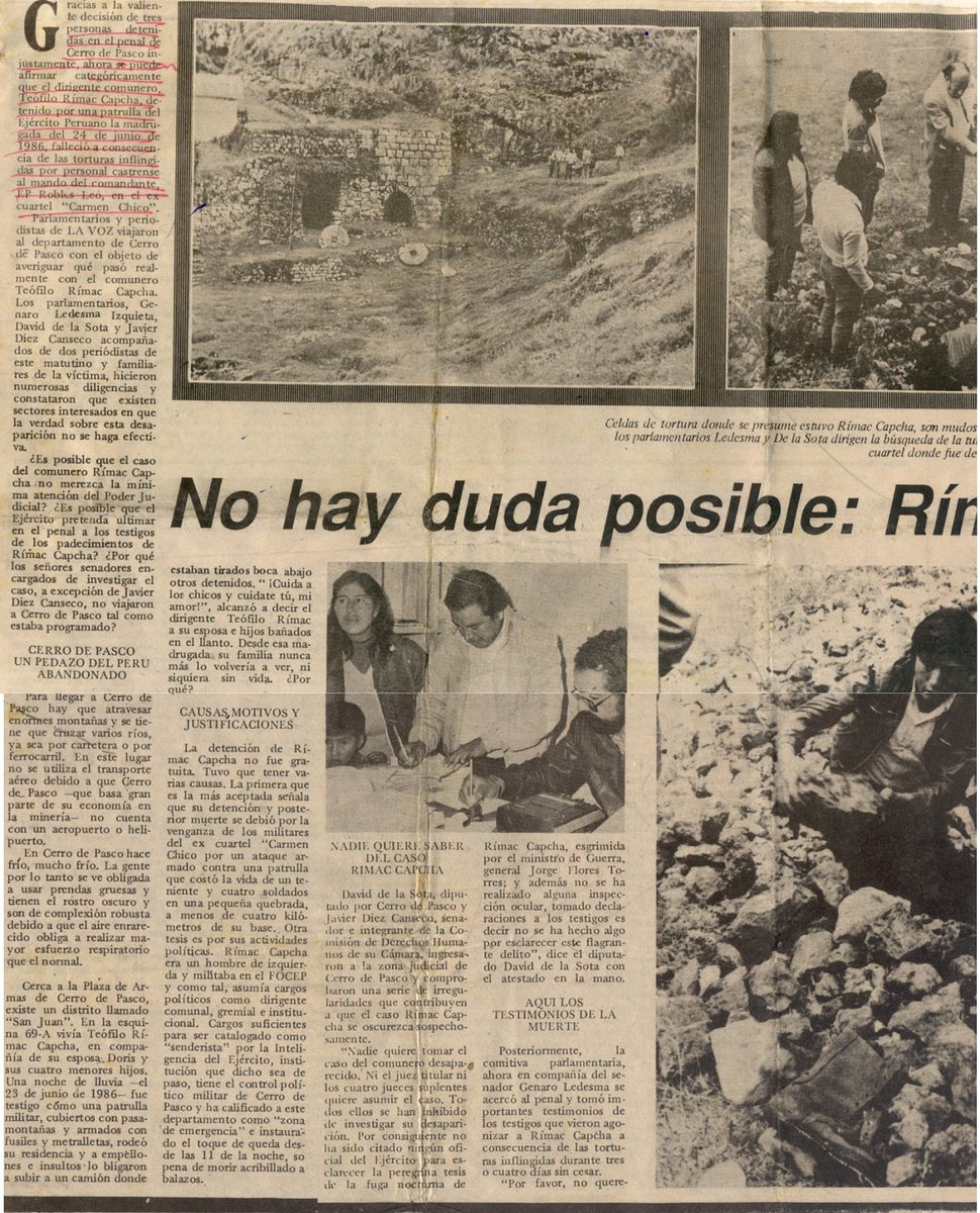 Teófilo Rímac Capcha, El 23 de junio de 1986, varios militares uniformados lo secuestraron desde su domicilio ubicado en San Juan Pampa en Cerro de Pasco, para posteriormente desaparecerlo. Fue líder sindical.